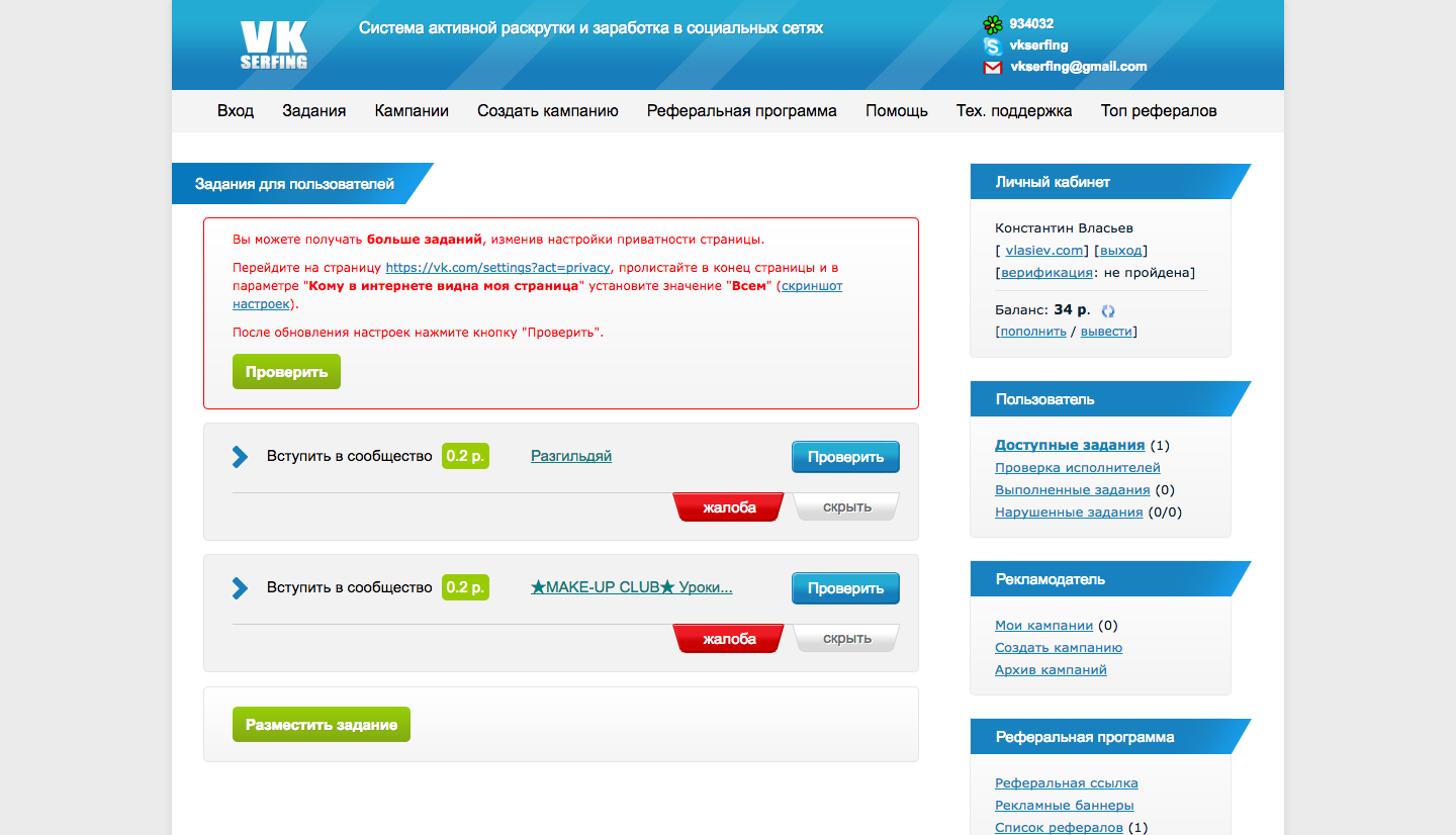 VKserfing - биржа заработка и раскрутки в социальных сетях.