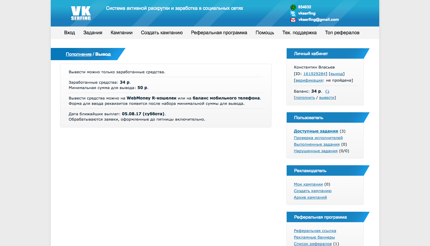 Это заработок на выполнении очень простых заданий в социальных сетях: вступление в сообщества (группы, паблики, встречи), публикация репостов, отметка лайками, добавление в друзья. Для работы на сайте достаточно иметь аккаунт ВКонтакте. Есть реферальная программа, вознаграждение которой составляет 10% с заработка пользователей и 8% с потраченных средств рекламодателей. Вывод средств производится на WebMoney или на телефон каждую субботу. Минимальная сумма для выплаты 50 р.